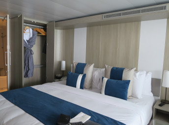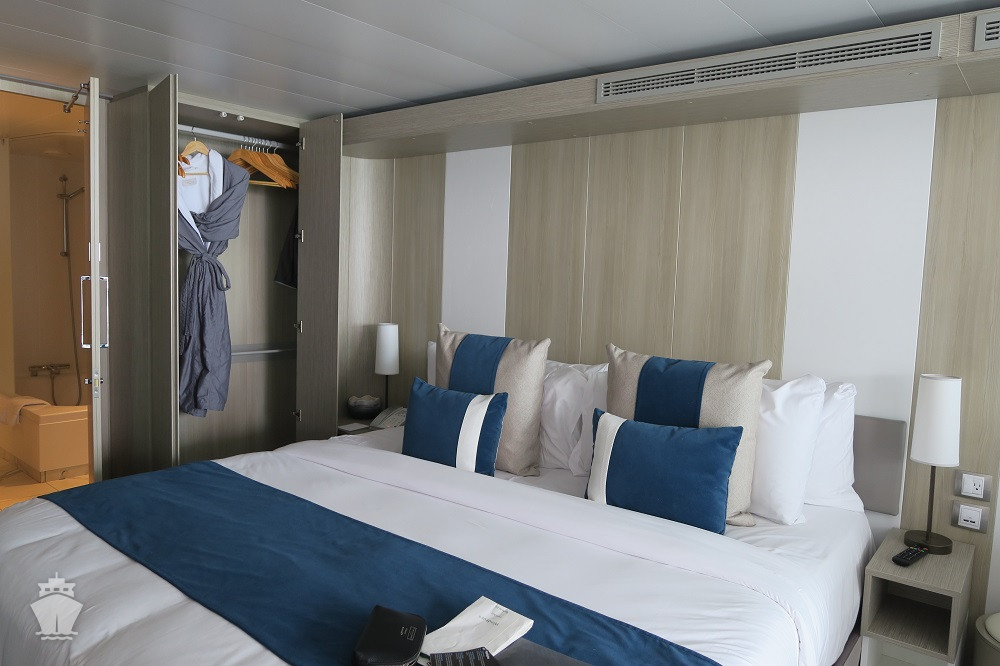 Všetky dvojposteľové kajuty sú vybavené manželskými posteľami veľkosti King (193 x 203 cm) s kašmírovou posteľnou bielizňou, zatiaľ čo sólo Infinite Veranda kajuty majú postele veľkosti Queen (152 x 203 cm) .