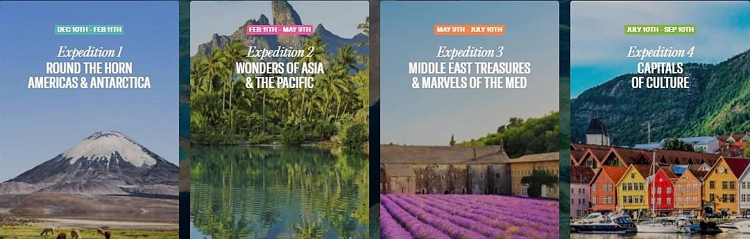- podľa záujmu a časových možností si klienti môžu zarezervovať kompletný program Ultimate World Cruise alebo si vybrať jeden či viac zo štyroch segmentov, so širokou škálou destinácií: Ameriky, Ázia a Tichomorie, Stredozemné more a Severná Európa: