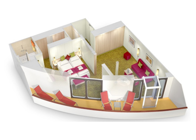 SX - Suite Panorama-Deluxe PREMIUM 54 m² (vrátane balkóna 12 m²). 12. paluba. Max 4 osoby. Cenový model Premium + výhody Suite. | 3 050 € 1 525 € za osobu |