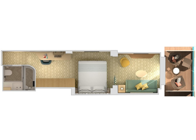 HE - Kajuta Havana Cabana s patiom 19 m² + vonkajšie patio 8 m². 8. paluba vpredu. Tropický štýl, vstup do exkluzívnej zóny Havana. | 2 154 € 1 077 € za osobu |