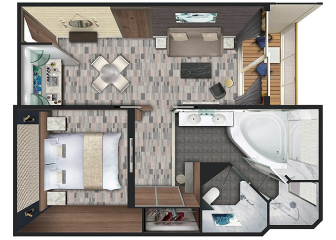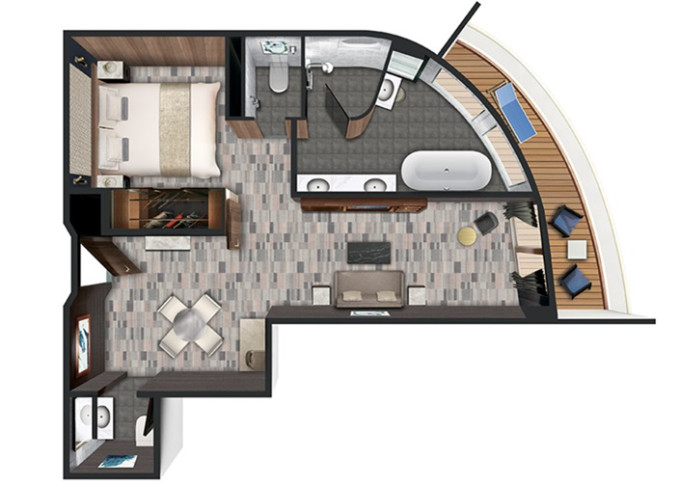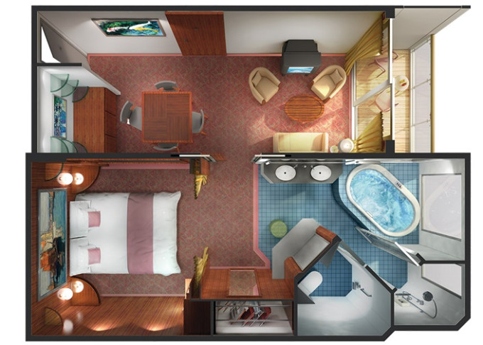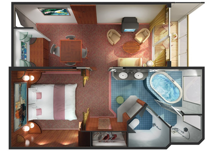SC - Forward-facing Deluxe Penthouse Suite 51 m² / balkón 10 m². Vírivka. 10. paluba - vpredu. Max 3 osoby. Výhody Suite. | 23 048 € 11 524 € za osobu | ||