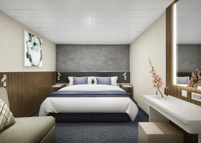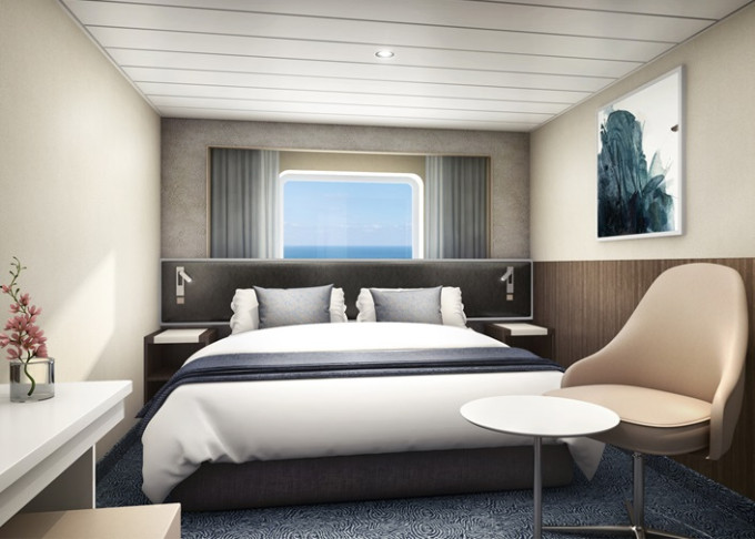 O3 - Vonkajšia kajuta Deluxe 26 m². Veľké neotvárateľné okno. 8. paluba - vpredu. Max 3 osoby. | 5 450 € 2 725 € za osobu |