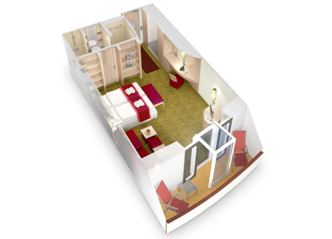 BP - Kajuta s balkónom Panorama PREMIUM 21,5 m² / balkón 4,5 m². Max 3 osoby. Cenový model Premium + výhody Suite. | 3 780 € 1 890 € za osobu |