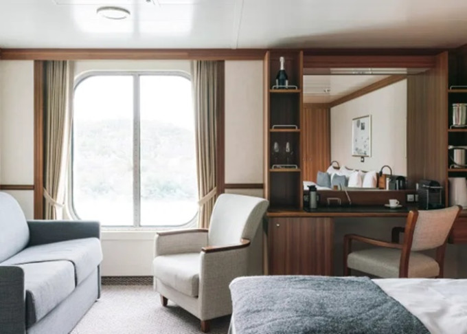 Q2 - Expedition Mini Suite 15-20 m². Veľké neotvárateľné okno. Obývacia časť, TV and mini-bar. Upper paluba. Max 2 osoby. Výhody Suite. 20 666 € 10 333 € za osobu