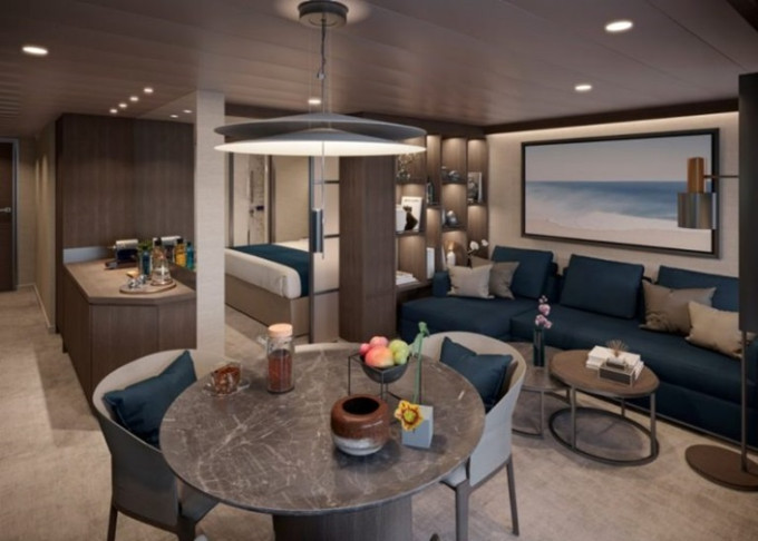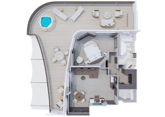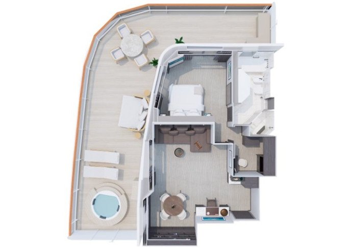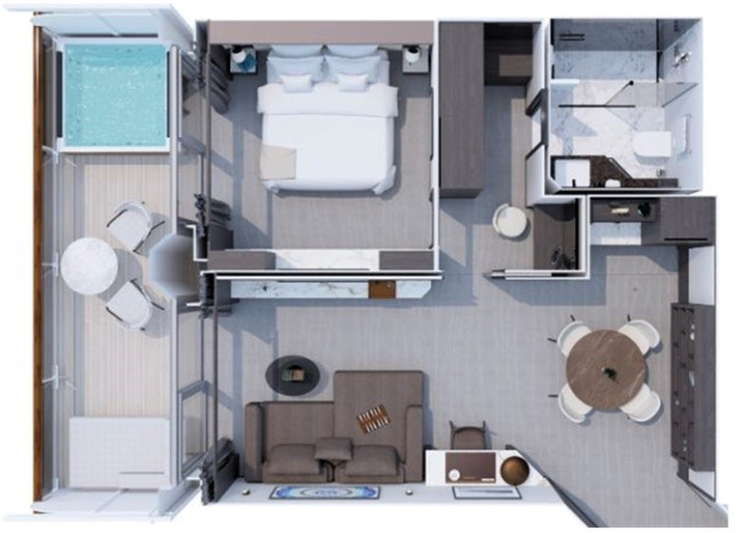 Ocean Residence - Cove Residence Suita 56 m² + Terasa s vírivkou, sedením a pohovkou alebo lehátkami 14 m² / 6. paluba: 24 m². Spálňa s obývacou a jedálenskou časťou, šatník. Koktailová súprava, minibar, kávovar, vodná kanvica, ďalekohľad, sejf, kúpeľňa so sprchou. Závesy, svetlo, klimatizácia ovládané smart technológiou. Taška Technogym Case Kit. Fľaša šampanského na privítanie. Maximálna kapacita 3 osoby. | 22 110 € 7 370 € za osobu |