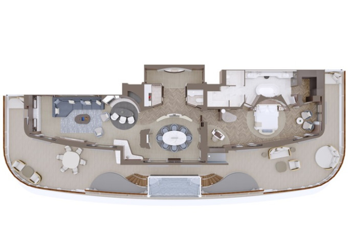Ocean Grand Penthouse Suita 47 m² + terasa so sedením a pohovkou 21 m² / na 6. palube terasa 13 m². Oddelená spálňa, obývacia a jedálenská časť, veľký šatník. Minibar, kávovar, vodná kanvica, ďalekohľad, sejf, kúpeľňa so sprchou. Taška Technogym Case Kit. Fľaša šampanského na privítanie. Maximálna kapacita 3 osoby. | 20 946 € 6 982 € za osobu |