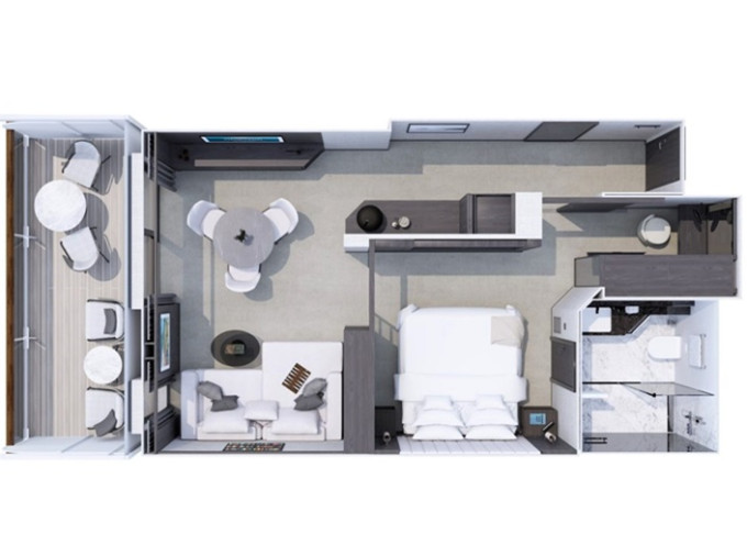 Ocean Residence - Cove Residence Suita 56 m² + Terasa s vírivkou, sedením a pohovkou alebo lehátkami 14 m² / 6. paluba: 24 m². Spálňa s obývacou a jedálenskou časťou, šatník. Koktailová súprava, minibar, kávovar, vodná kanvica, ďalekohľad, sejf, kúpeľňa so sprchou. Závesy, svetlo, klimatizácia ovládané smart technológiou. Taška Technogym Case Kit. Fľaša šampanského na privítanie. Maximálna kapacita 3 osoby. | 37 900 € 9 475 € za osobu |