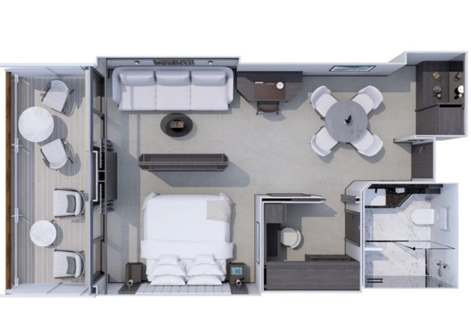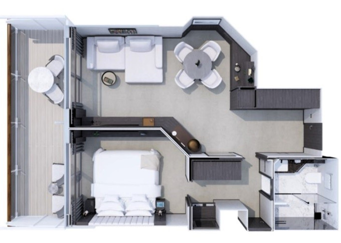 Ocean Residence - Cove Residence Suita 56 m² + Terasa s vírivkou, sedením a pohovkou alebo lehátkami 14 m² / 6. paluba: 24 m². Spálňa s obývacou a jedálenskou časťou, šatník. Koktailová súprava, minibar, kávovar, vodná kanvica, ďalekohľad, sejf, kúpeľňa so sprchou. Závesy, svetlo, klimatizácia ovládané smart technológiou. Taška Technogym Case Kit. Fľaša šampanského na privítanie. Maximálna kapacita 3 osoby. | 44 220 € 11 055 € za osobu |