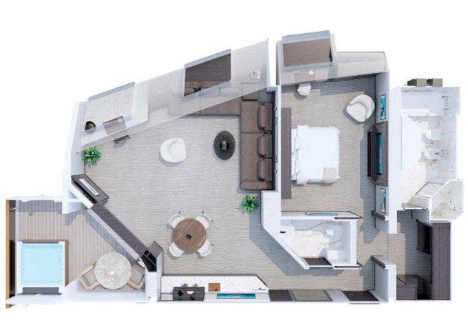 Ocean Residence - Cove Residence Suita 56 m² + Terasa s vírivkou, sedením a pohovkou alebo lehátkami 14 m² / 6. paluba: 24 m². Spálňa s obývacou a jedálenskou časťou, šatník. Koktailová súprava, minibar, kávovar, vodná kanvica, ďalekohľad, sejf, kúpeľňa so sprchou. Závesy, svetlo, klimatizácia ovládané smart technológiou. Taška Technogym Case Kit. Fľaša šampanského na privítanie. Maximálna kapacita 3 osoby. | 31 584 € 10 528 € za osobu |