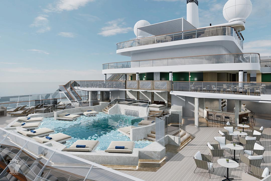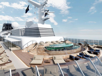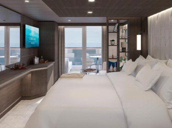 Ocean Suites - Ocean Grand Terrace Suite Suita 28 m² + kúpeľňa 4 m² + terasa so sedením a pohovkou 11 m². Spálňa s obývacou časťou, šatník. Minibar, kávovar, vodná kanvica, ďalekohľad, sejf, kúpeľňa so sprchou. Fľaša šampanského na privítanie. 6, 7. paluba. Maximálna kapacita 2 dospelé osoby + 1 dieťa do nedovŕšených 18 rokov. | 20 040 € 10 020 € za osobu |