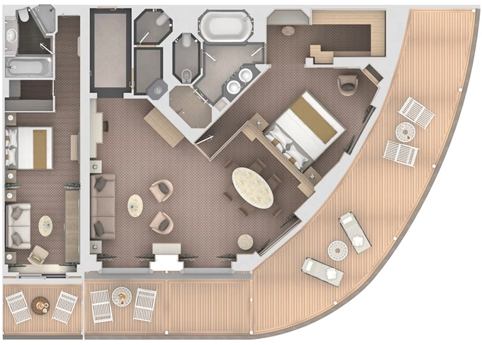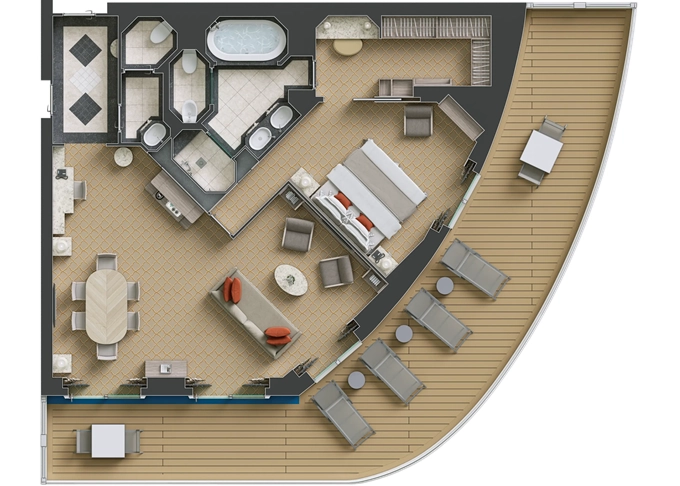 G1 - Grand Suite 1 137 - 146 m² (vrátane balkóna 44-53 m²). 8,9. paluba vpredu. Max 3 osoby. 42 600 € 42 600 € za osobu