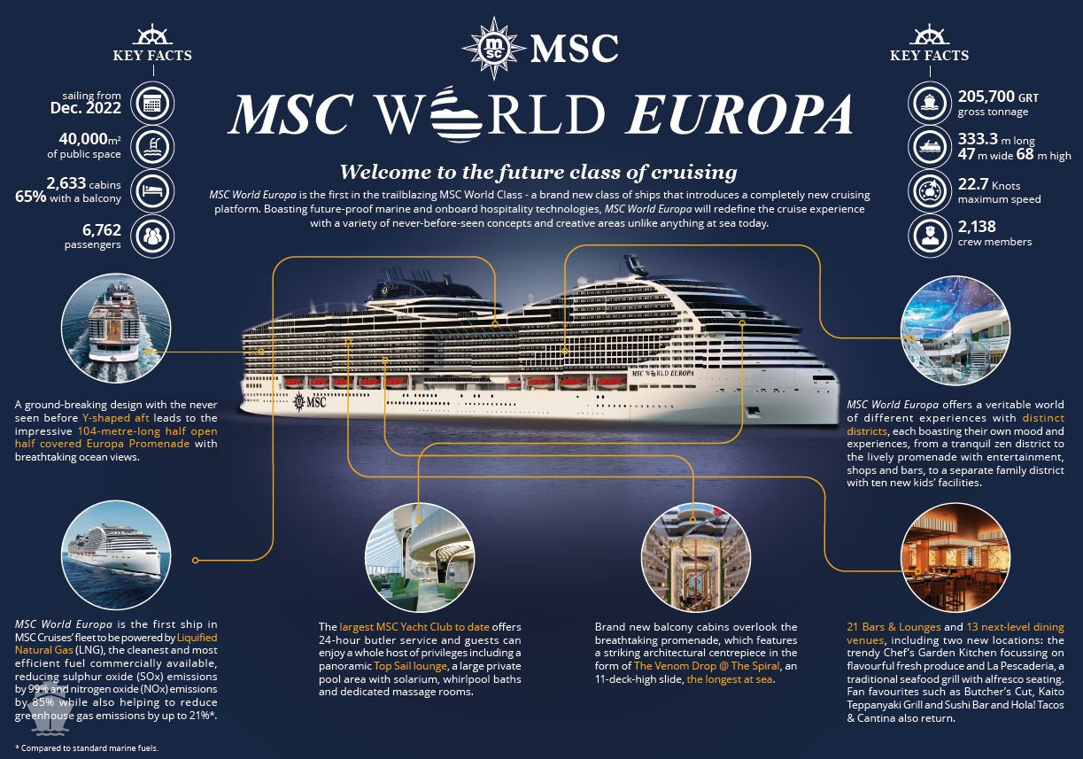 Je prvou loďou vo flotile MSC s pohonom na LNG. Využitie LNG reálne zníži emisie SOx o 99% a emesie NOx (oxidov dusíka) o 85%. World Europa taktiež ako vôbec loď prvá zavádza revolučný projekt PACBOAT s integráciou demonštrátora pre novú generáciu 50 kW palivového článku.