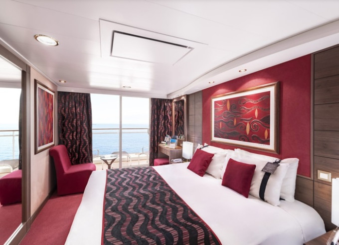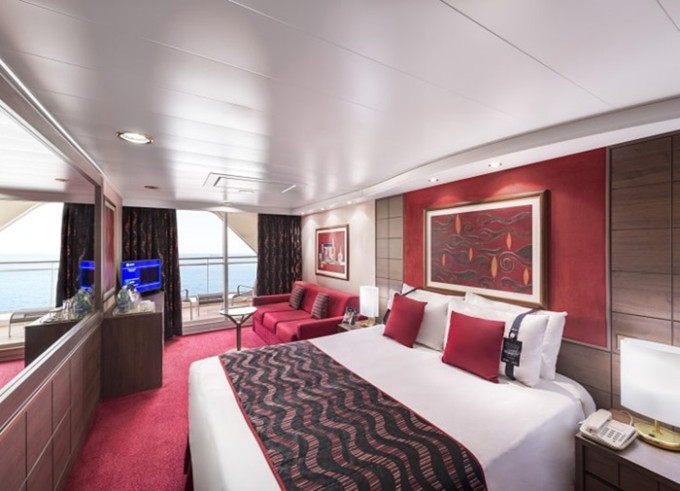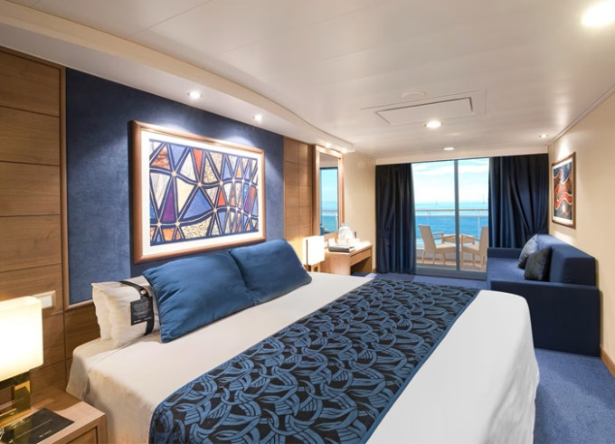 Suite s balkónom: cca31m², kajuta s manželskou posteľou (na požiadanie 2 oddelené postele) a rozkladacia pohovka. Klimatizácia, kúpeľňa s vaňou, toaletný stolík, priestorná skriňa, interaktívna TV, telefón, minibar, sejf, sušič na vlasy. Balkón so stolíkom a stoličkami. Internetové pripojenie (za poplatok).