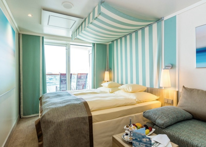 VG - Kajuta s verandou PREMIUM od 16 m² + balkón 6 m². 9. až 14. paluba. Max 4 osoby. Cenový model Premium. 2 430 € 1 215 € za osobu