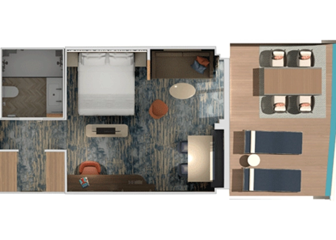HS - Suite Havana Cabana 28 m² + vonkajšie patio 11 m². 8. paluba vpredu. Tropický štýl, vstup do exkluzívnej zóny Havana. Výhody Suite. | 2 938 € 1 469 € za osobu | ||