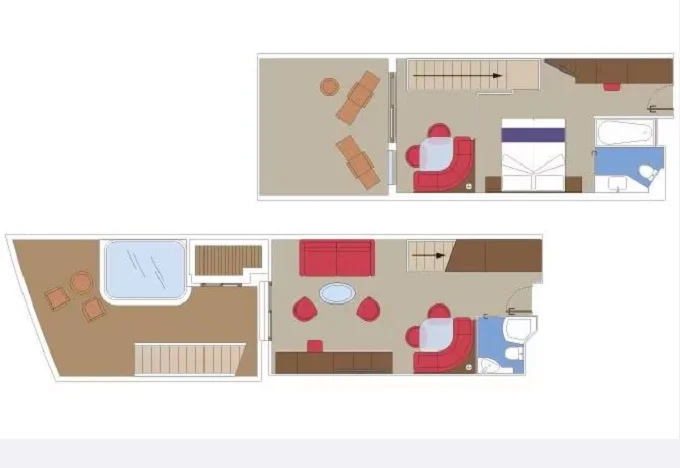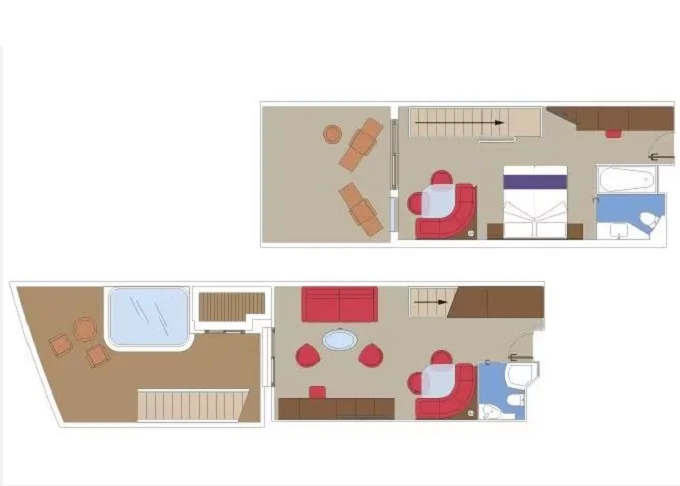 YJD - Yacht Club Duplex Suite s vírivkou 46 m² + balkón 30 m². Vírivka. 2 podlažia, šatník, 2 kúpeľne (1 s vaňou). Max 4 osoby. 16. paluba. Cenový model MSC Yacht Club. | 10 984 € 2 746 € za osobu | ||