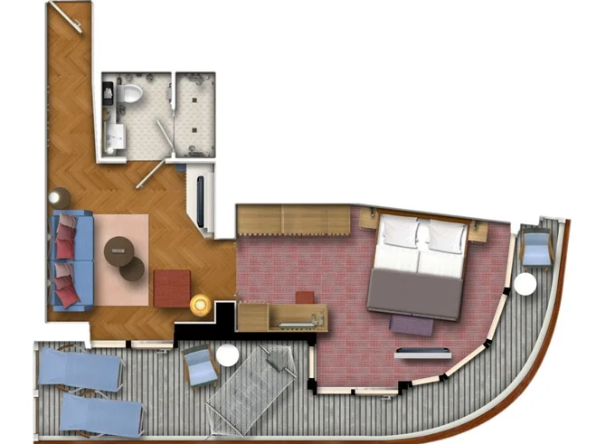 SHZO - Horizont Suite 38-40 m² + balkón 16 m² s ležadlami a hojdacou sieťou. Obývacia časť a oddelená spálňa. 7-8. paluba. Max 4 osoby. Výhody Suite. 7 456 € 1 864 € za osobu